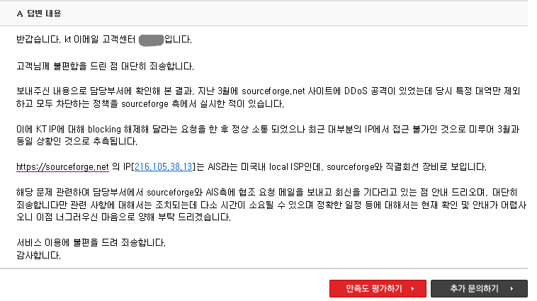 소스포지 접속안되는 현상으로 KT에 문의메일을 넣었었는데 최종적으로 답변이 왔다.