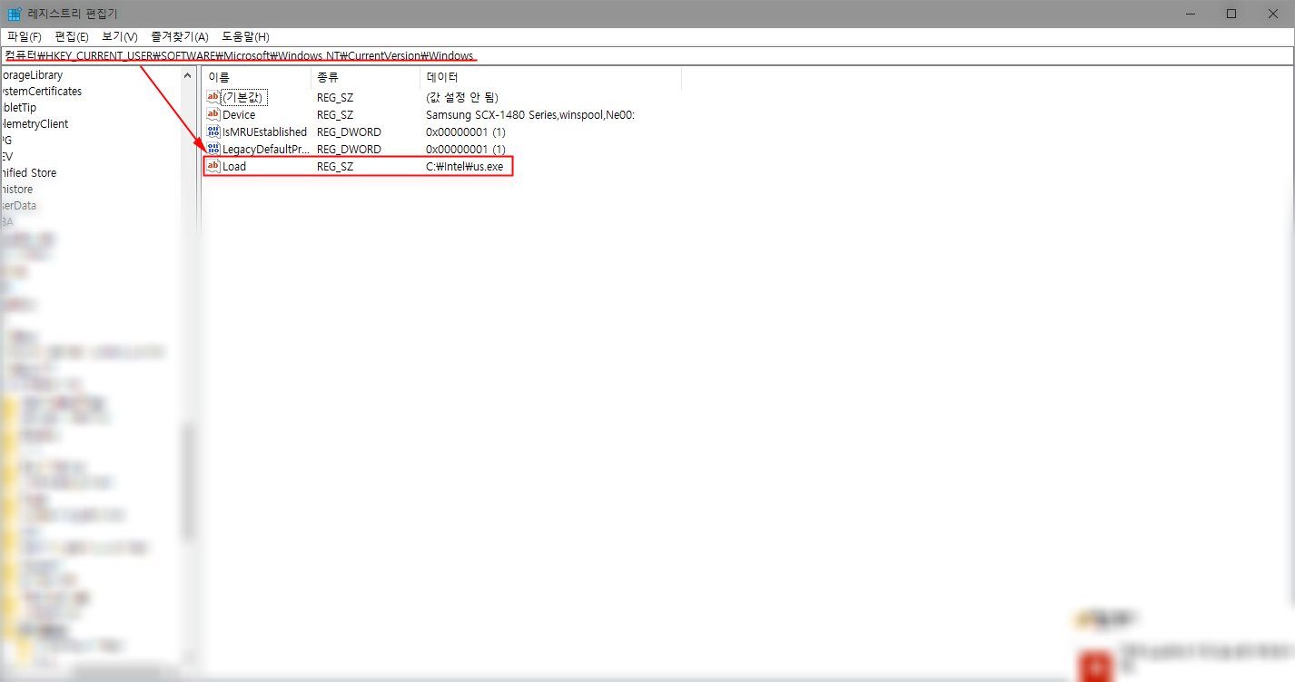 해결방법은 레지스트리 편집기를 실행 한 뒤 HKEY_CURRENT_USER\SOFTWARE\Microsoft\Windows NT\CurrentVersion\Windows 경로에 있는 'Load' 키를 삭제해주자.