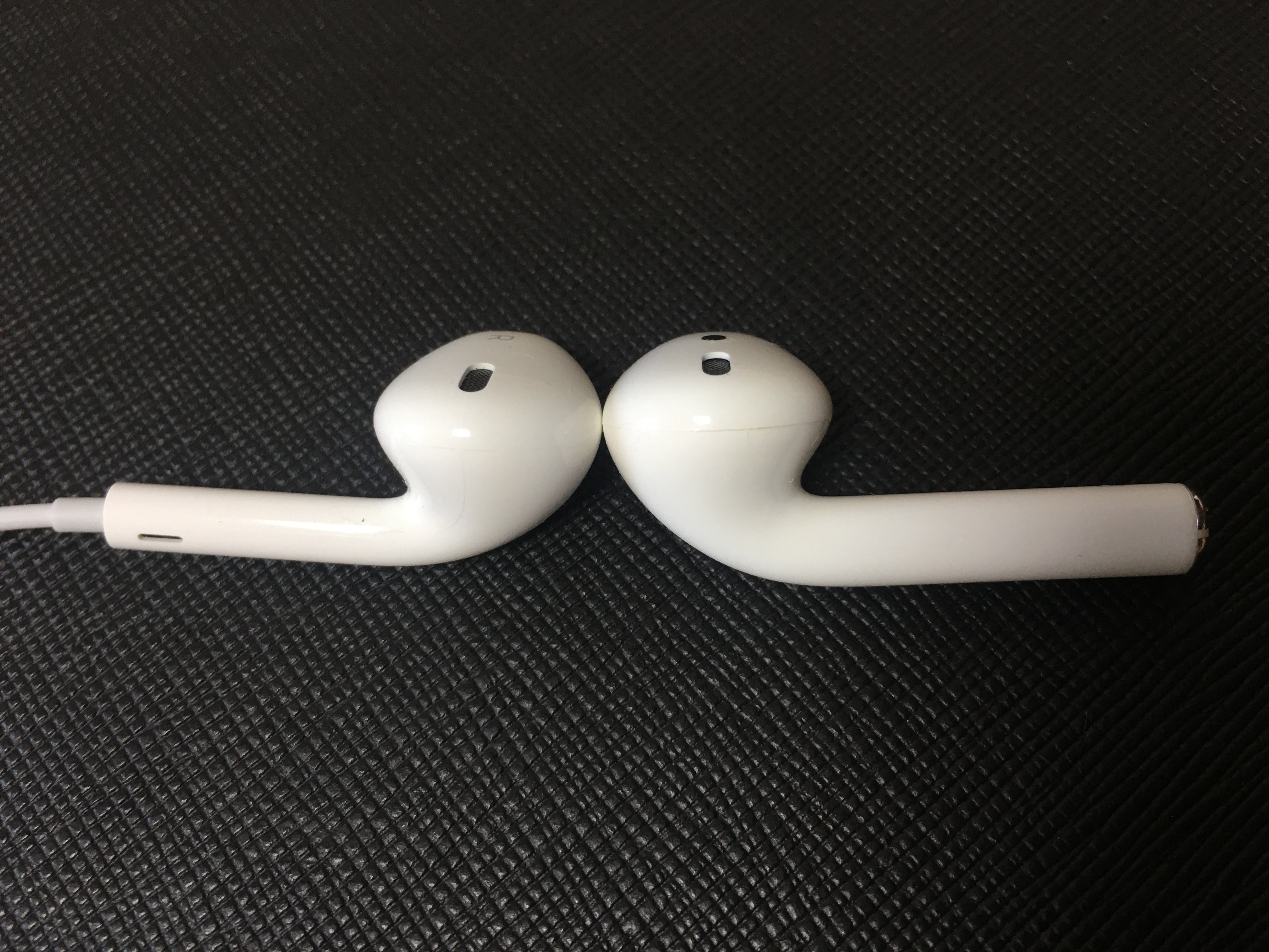 에어팟이 유독 마감 문제가 많은데, 실제로 봐보니 아쉽기는 하다. 왼쪽이 기존에 사용하던 '이어팟'이고 오른쪽이 '에어팟'이다. 에어팟 유닛 마감이 떨어지다 보니 오른쪽처럼 틈이 눈에 띄는 편이다. 오래 사용하다 보면 그 틈 사이로 먼지나 때가 끼고 더러워져 보일 듯하다. 실제로 만져보면 틈이 까끌까끌하게 느껴진다. 다행히 귀에 장착했을 때 불편한 느낌은 없었다.