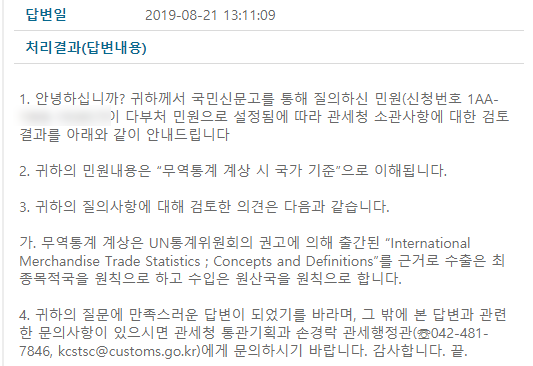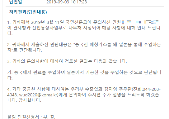 글을 올리고 난 뒤 제기된 의문점들. 솔직히 말해서 이렇게 까지 찾아볼 일이었는지 의문이다. 그만큼 말도안되는 주장들이 퍼지고 믿어지고 있다는 증거겠지. 의문점들을 살펴보면 수입은 원산지국가로 수출은 목적국가로 계상되는 이유와 근거 그리고 우리는 왜 중국이 원산지인 불화수소를 일본을 통해 수입했는가이다. 산업부와 관세청에 민원을 넣었고 아래와 같이 답이 왔다.