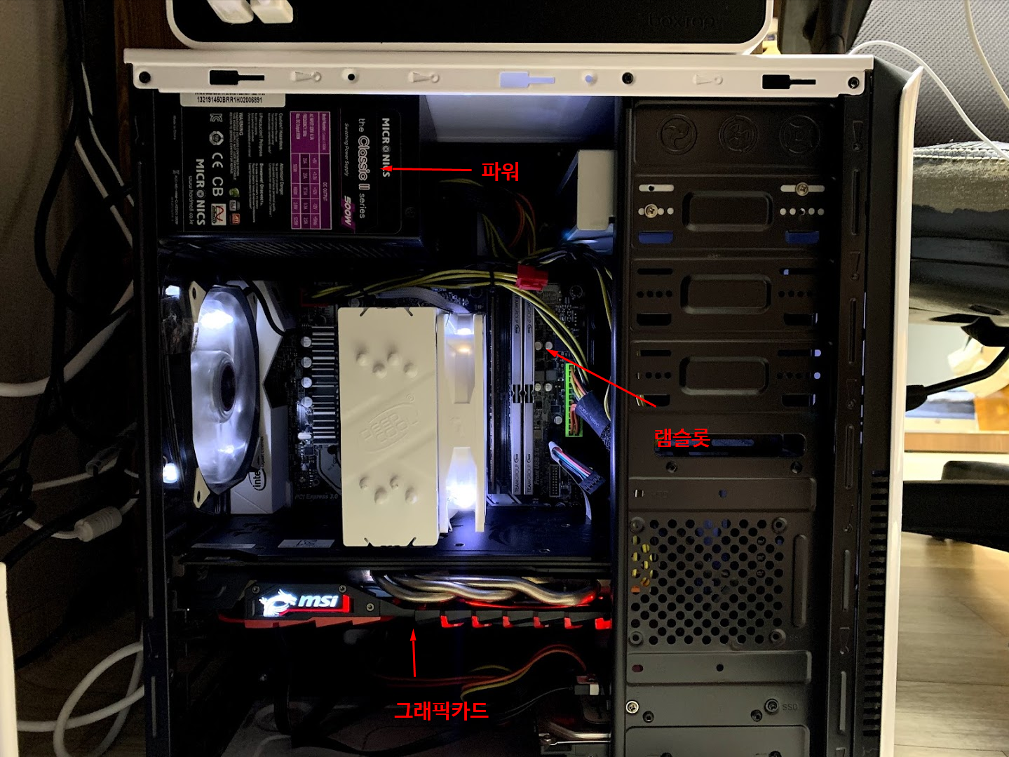 내 컴퓨터는 위 사진과 같이 구성되어 있고, 얼마전 그래픽카드 전원문제로 블랙 스크린 현상이 자주 발생했기 때문에 가장 먼저 그래픽카드를 분리했다. 그래픽카드를 분리해도 같은 증상이 반복되었다. 다음 순서로는 램카드를 하나씩 분리해봤다. 현재 3개의 램카드가 장착되어 있는데 하나 분리하고 전원 넣고, 또 하나 분리하고 전원 넣고 반복해봤다. 다행히도 램 문제였는지 램카드 하나를 분리하고 전원을 넣자 정상적으로 부팅이 되었다.
