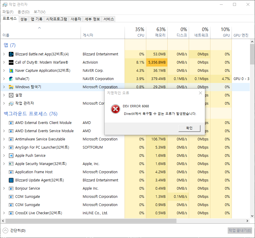 게임 플레이 중 불규칙적으로 DEV ERROR 6068 에러가 발생한다.