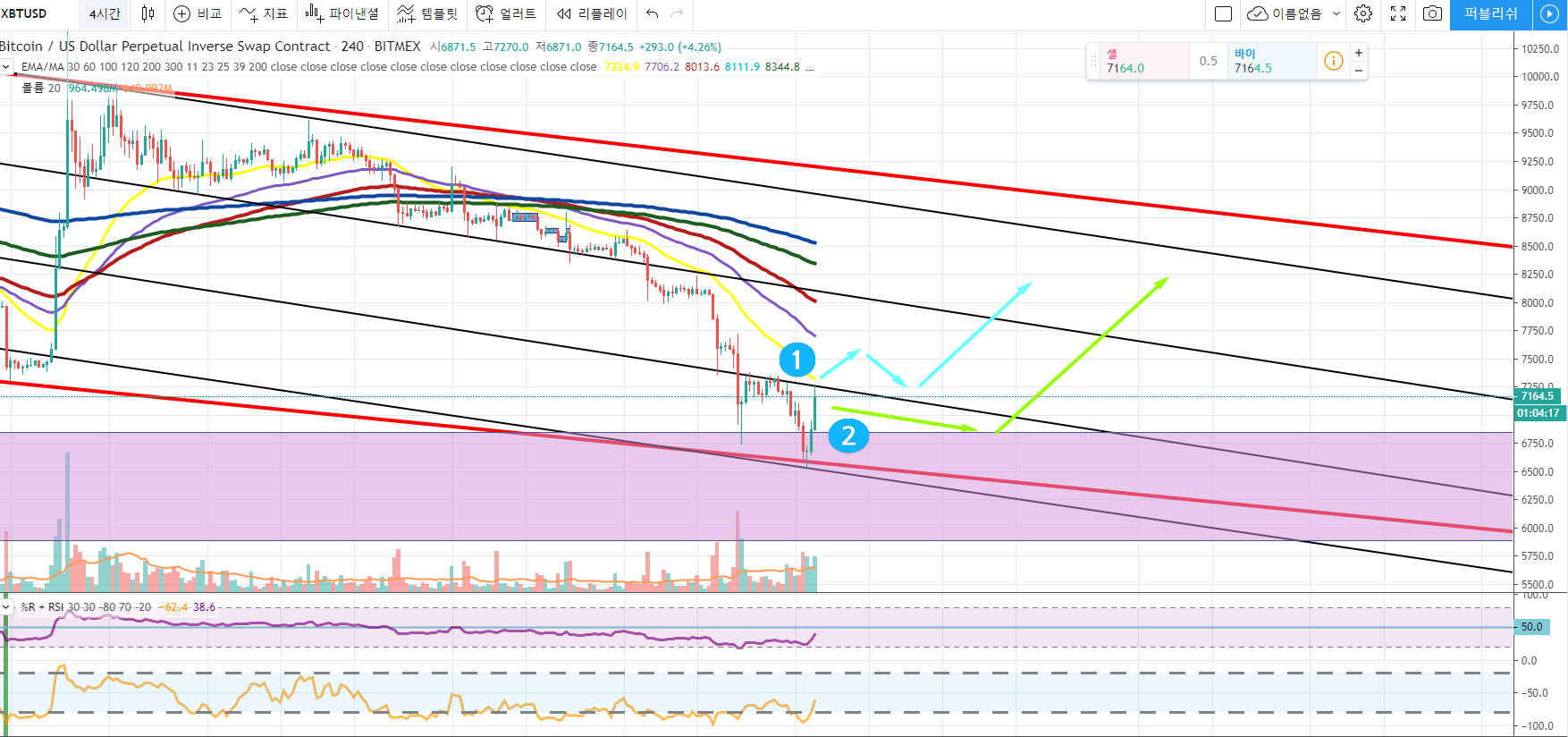 4시간봉을 보면 추세전환이라고 보여지겠지만 아직까지 대추세인 하락장인걸 염두해야한다.