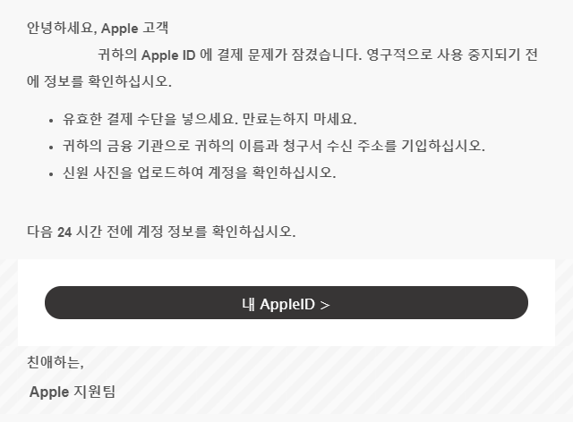 귀하의 Apple ID 에 결제 문제가 잠겼습니다. 영구적으로 사용 중지되기 전에 정보를 확인하십시오.
