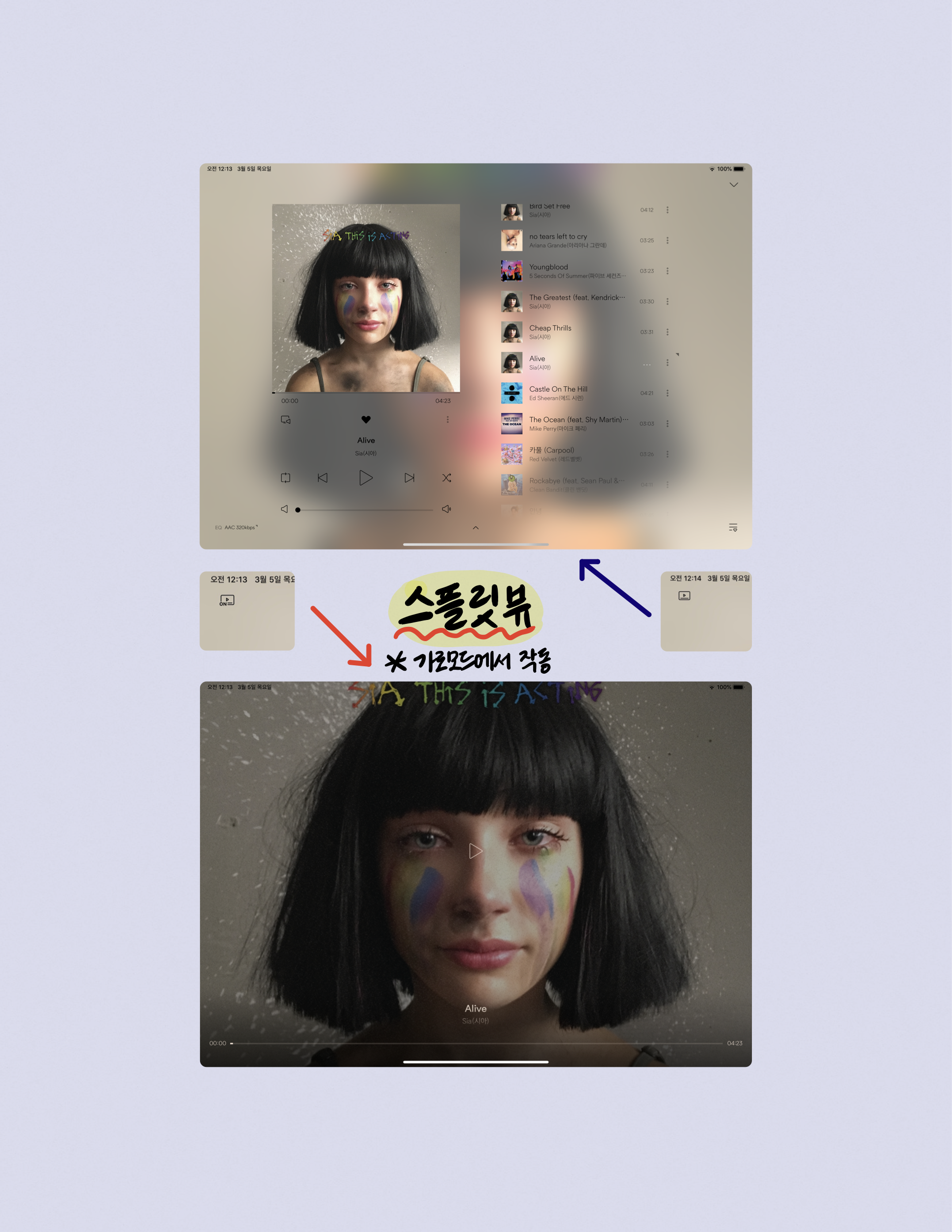 어떤 모드로 사용할 진 개안의 취향차이겠지만, 아이패드는 가만히 음악만 재생할 때는 스플릿뷰 기능을 사용하고, 아이패드로 다른 작업을 가로모드로 사용할때는 꺼놓는게 훨씬 나아보인다.