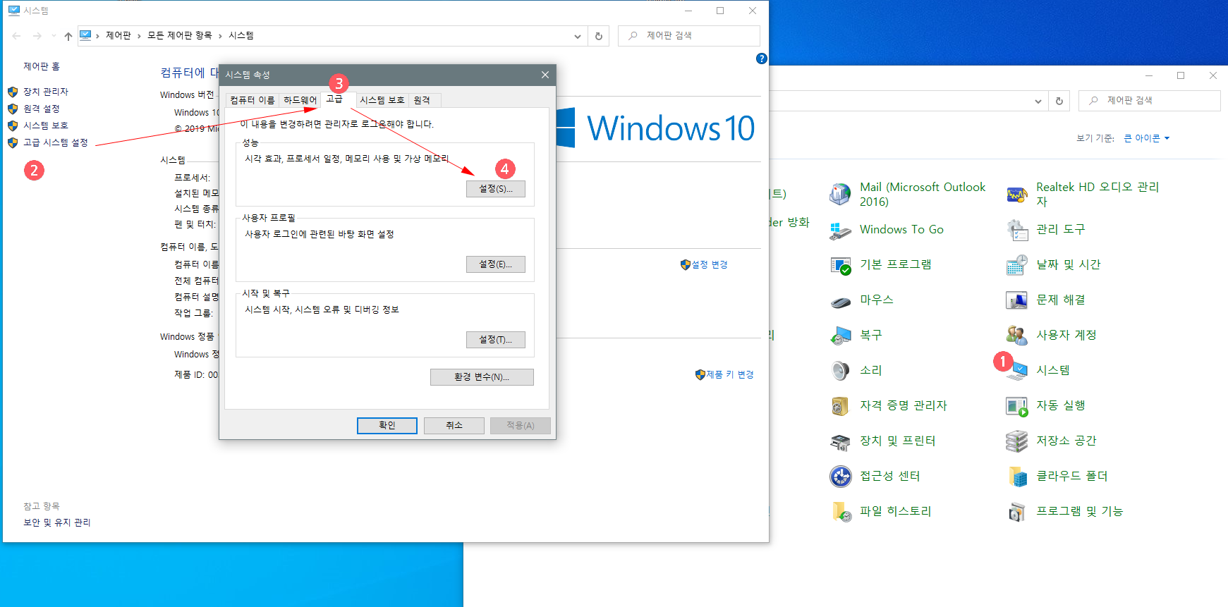 1. 제어판 - 시스템 - 고급 시스템 설정 - 고급 - 성능탭의 설정으로 진입한다.