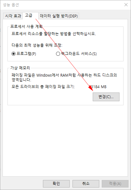 2. 고급 - 가상메모리 탭에 '변경'으로 들어간다.