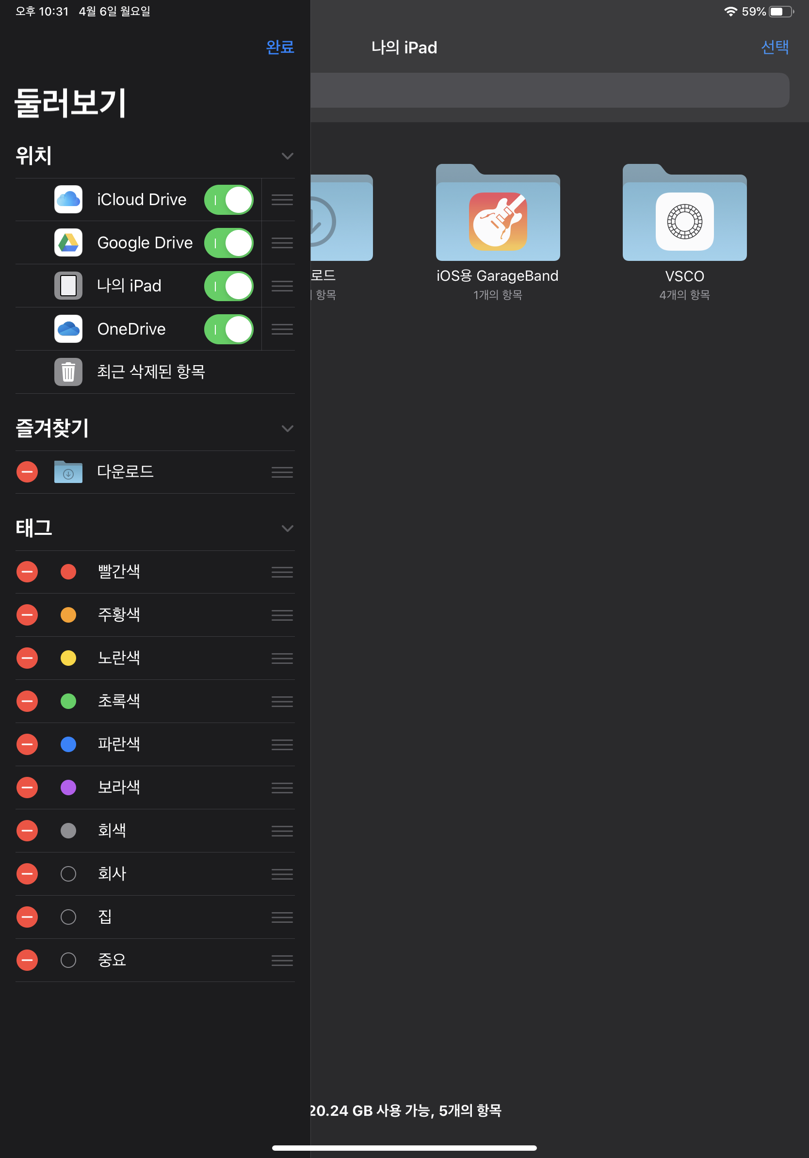'파일'앱은 윈도우로 치면 파일탐색기와 동일하다. 내 아이폰과 아이패드에 저장되어 있는 문서와 파일들을 관리할 수 있고, 아이클라우드 파일 또한 관리가 가능하다. 더 나아가서 구글드라이브와 마이크로소프트의 OneDrive 도 추가하여 관리가 가능하다. 나 같은 경우에는 대학교에서 기본적으로 오피스365와 함께 원드라이브를 지원하고 있다. 그래서 과제나 팀플, 강의PPT자료를 아이패드로 쉽게 내려받고 올리기 위해 원드라이브를 사용중이다.