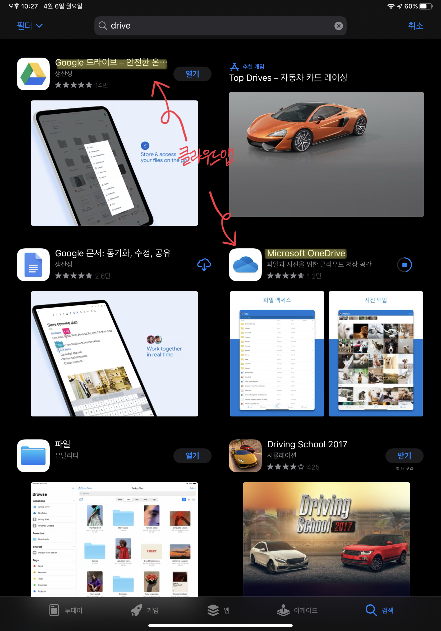 1. 앱스토어에서 'Google 드라이브' 또는 'One Drive' 를 설치한다.