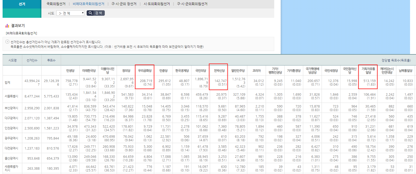 친박세력과 태극기로 대표되는 극우세력은 세력이 어느정도일까? 비례대표 투표율을 보면 우리공화당은 20만명(0.74%), 친박신당 14만명(0.51%), 기독자유통일당 51만명 (1.83%)명이다. 즉 85만명정도인데, 전국민으로 따지면 3%밖에 안되는 세력이다. 근데 이 3%밖에 안되는 세력이 전체 보수진영의 주류인것마냥 행세해왔다. 광화문에서 태극기와 성조기를 흔들고, 전영훈 같은 목사가 나와서 막말을 일삼았다. 또한 미래통합당에는 '집토끼 다 놓칠꺼냐' 라는 말도안되는 궤변으로 당을 흔들었다. 정말 비정상적인 구조가 아닐수가 없다.