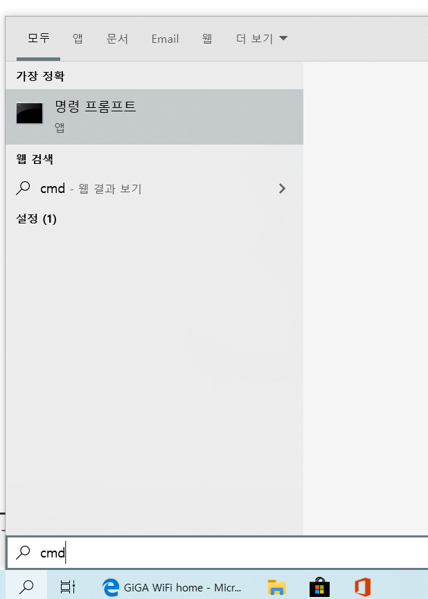우선 컴퓨터에서 검색창에 cmd를 쳐준 뒤 명령프롬프트를 실행한다.