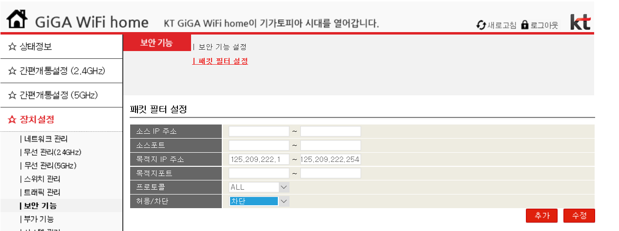 KT 와이파이 설정화면에 접속을 했다. 여기서 왼쪽에 '장치설정' - '보안기능' - '패킷 필터 설정' 에 들어간다.