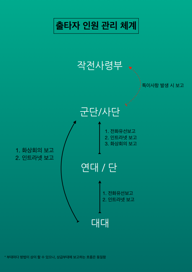 이후 사항은 부대마다 다르긴 하지만, 일반적으로 대대에서 복귀 상황을 취합한 뒤, 바로 위 상급부대인 연대 또는 단급 부대에 유선보고와 인트라넷 당직게시판을 통해 "오늘 출타자 9명이며, 총 복귀자 9명 이상 무" 라는식으로 보고를 올린다. 이후 연대와 단급 부대에서는 밑에 있는 대대들의 총 출타인원들을 취합하여 이상이 없으면 사단 또는 군단급 부대에 유선보고를 하고, 인트라넷 당직 게시판에 글을 쓴다. 최종적으로 20시쯤 있던 당직화상회의에 연대급/ 직할대대급 당직사령들이 참여해서 출타자에 대한 인원보고를 올린다. 이렇게 여러 단계에 걸쳐서 보고를 하도록 시스템이 짜여져 있다.