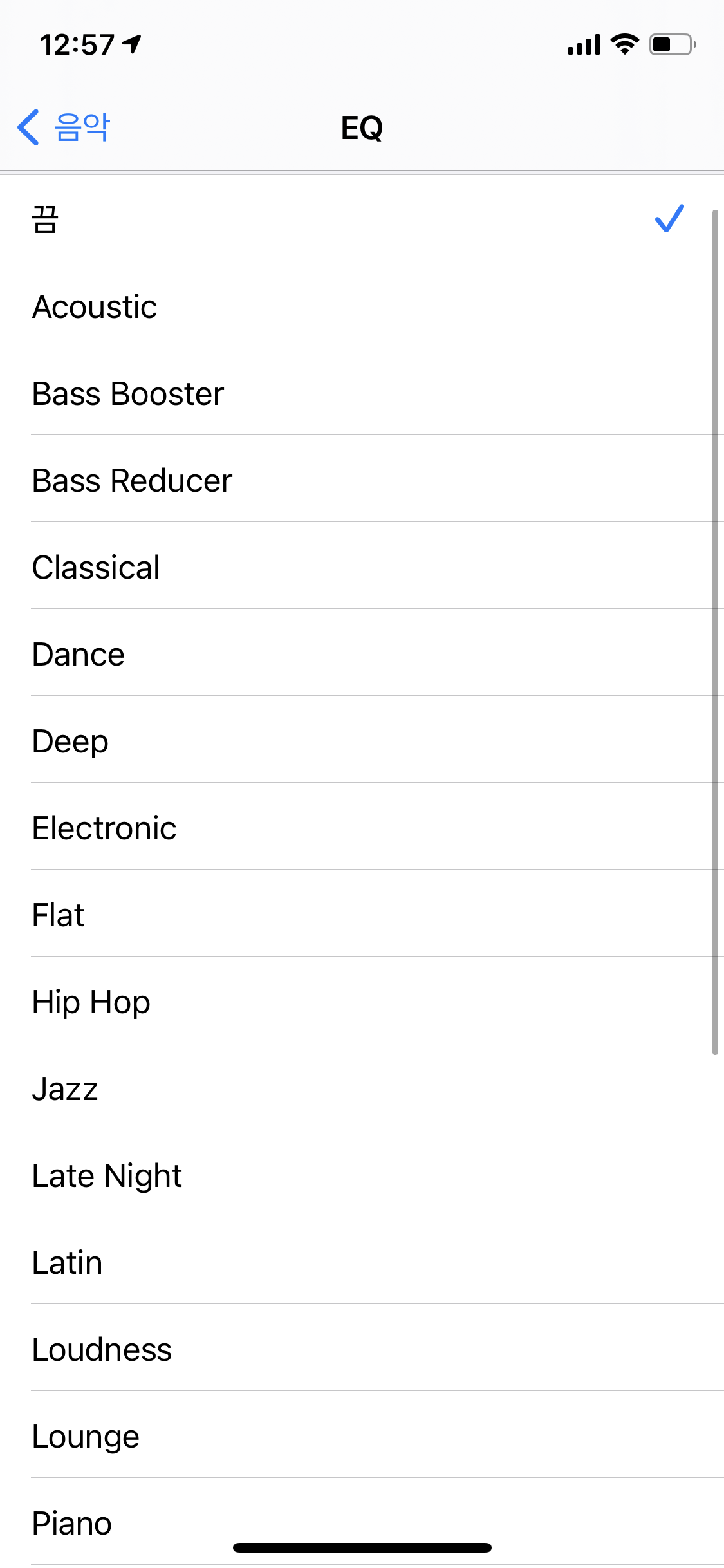3. 원하는 EQ 프리셋을 선택한다. 선택하는 즉시 이퀄라이저가 변경되기 때문에, 음악을 들어가면서 설정하는것이 좋다.