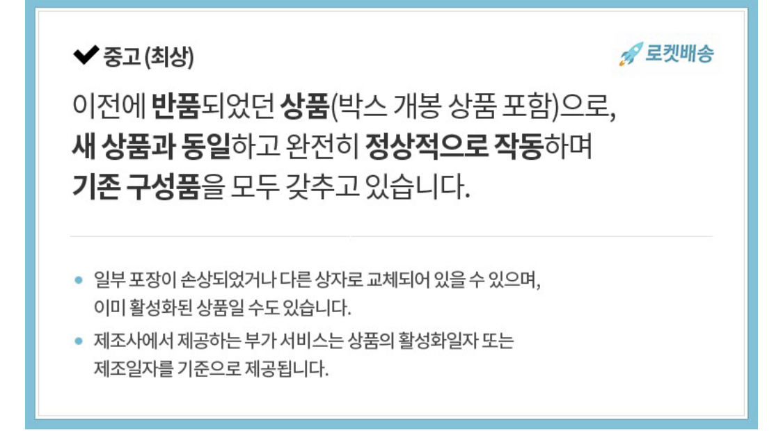 쿠팡 로켓배송 제품중에는 신제품만 파는것이 아니라 중고상품도 팔고 있다. 다른 사람이 로켓배송으로 물건을 주문하고 박스만 개봉한 채 반품을 했거나, 조금 사용해본다음 마음에 안맞아서 반품한 제품들을 일정부분 할인하여 판매하고 있다. 타이밍만 잘 맞는다면 좋은 상태의 물건을 비교적 저렴한 가격에 구매할 수 있다.